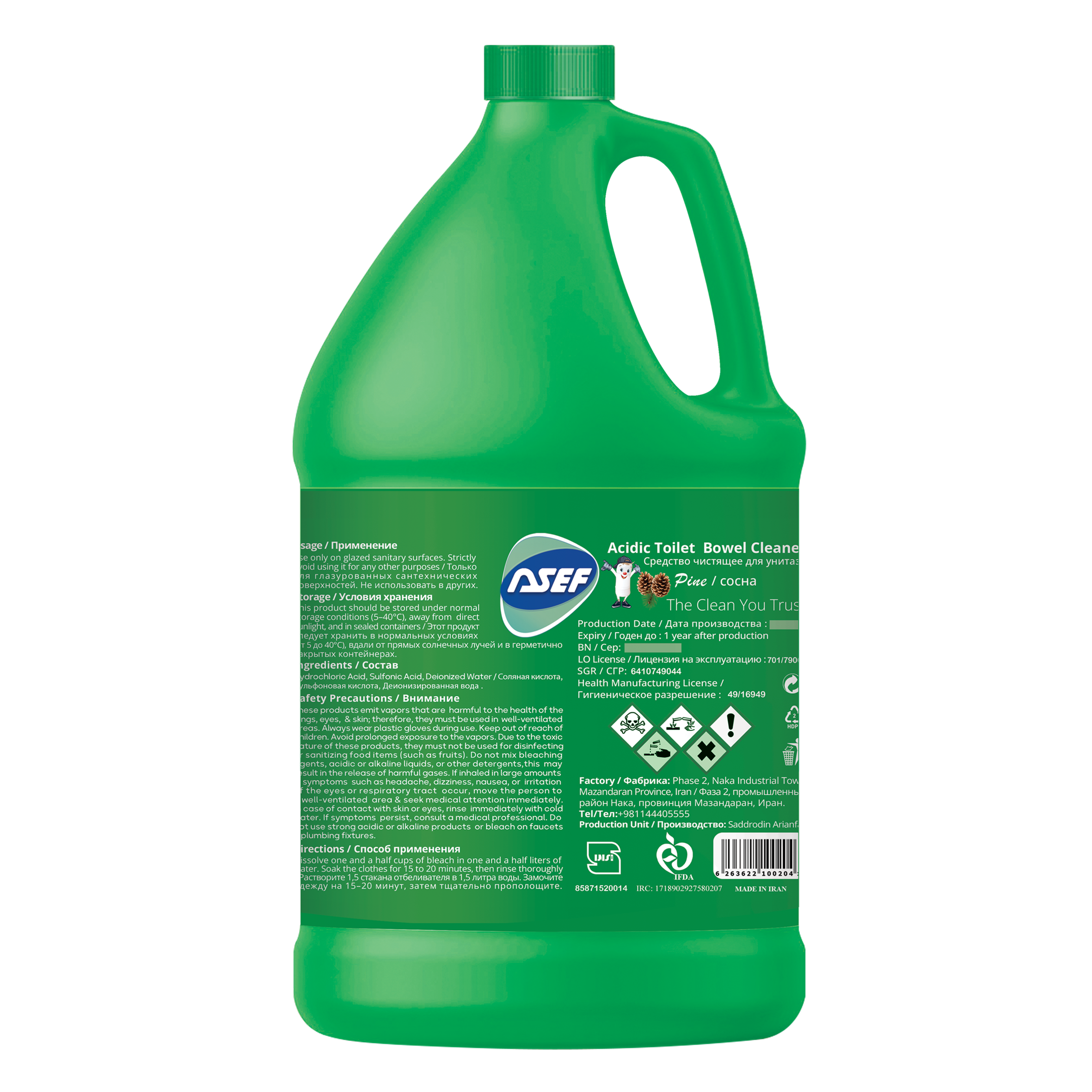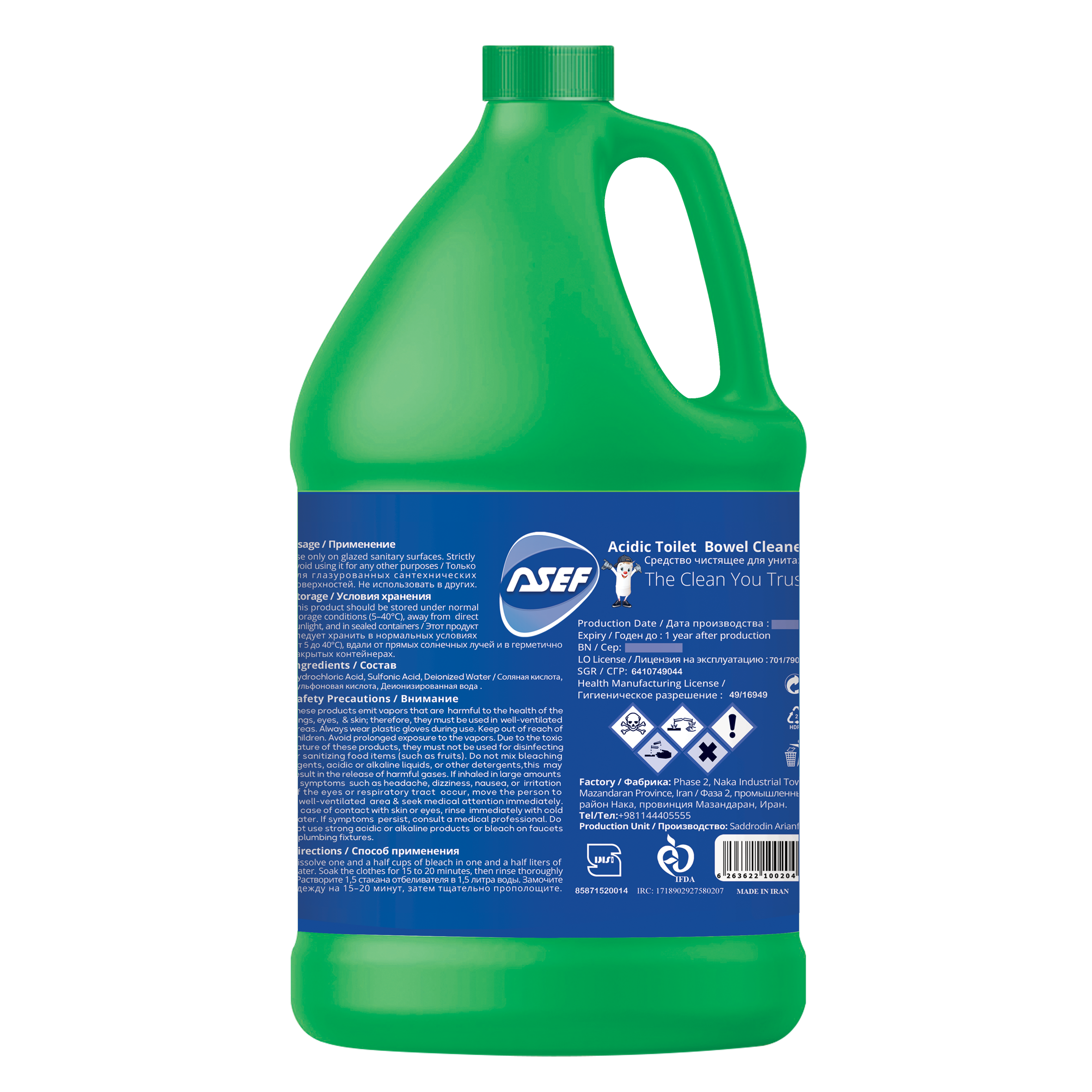 Asef Acidic Toilet Bowl Cleaner, with its strong acidic formula, is highly effective in removing limescale, yellow stains, and tough grime, leaving surfaces shiny and fresh. This product is ideal for cleaning toilets, bathrooms, and other surfaces affected by stubborn deposits and stains. It is designed for use in homes, hotels, restaurants, and commercial spaces, helping to maintain hygiene and the gleaming appearance of bathroom surfaces.